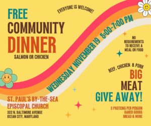 Next Wednesday, November 19th from 5-7pm, we are offering a Free Community Dinner of salmon or chicken with sides. Everyone is welcome! At the same time, we are having a […]
